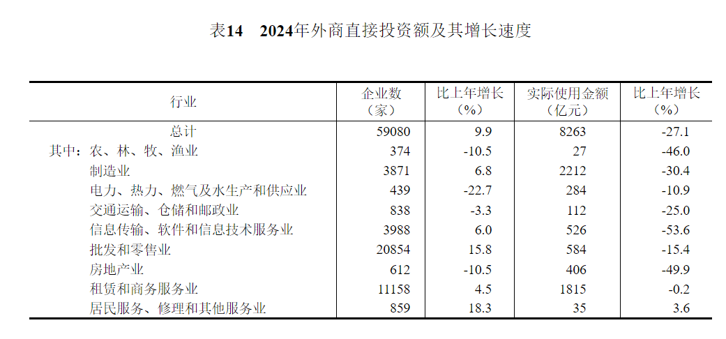 全年新设外商投资企业59080家,比上年增长9.9%。实际使用外资8263亿元,下降27.1%,折1162亿美元,下降28.8%。其中,共建“一带一路”国家(含通过部分自由港对华投资)对华新设外商投资企业17172家,增长23.8%;对华直接投资1147亿元,下降6.2%,折161亿美元,下降8.4%。高技术产业实际使用外资2864亿元,下降32.3%,折403亿美元,下降34.0%。