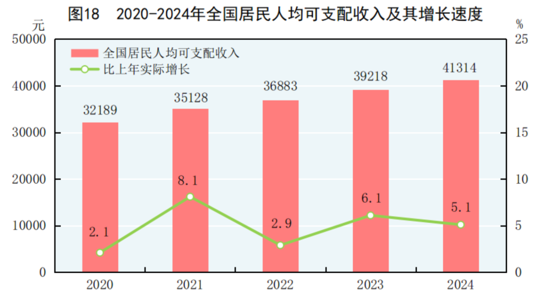 全年全国居民人均可支配收入41314元,比上年增长5.3%,扣除价格因素,实际增长5.1%。全国居民人均可支配收入中位数[61]34707元,增长5.1%。按常住地分,城镇居民人均可支配收入54188元,比上年增长4.6%,扣除价格因素,实际增长4.4%。城镇居民人均可支配收入中位数49302元,增长4.6%。农村居民人均可支配收入23119元,比上年增长6.6%,扣除价格因素,实际增长6.3%。农村居民人均可支配收入中位数19605元,增长4.6%。城乡居民人均可支配收入比值为2.34,比上年缩小0.05。按全国居民五等份收入分组[62],低收入组人均可支配收入9542元,中间偏下收入组人均可支配收入21608元,中间收入组人均可支配收入33925元,中间偏上收入组人均可支配收入53359元,高收入组人均可支配收入98809元。全国农民工人均月收入4961元,比上年增长3.8%。脱贫县[63]农村居民人均可支配收入17522元,比上年增长6.9%,扣除价格因素,实际增长6.5%。