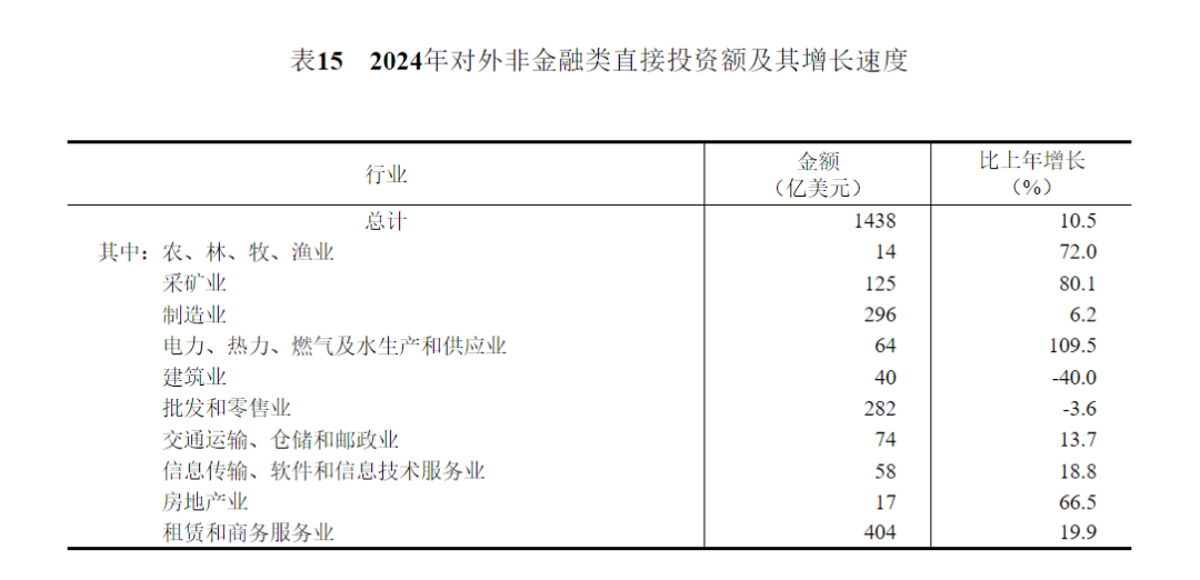全年对外非金融类直接投资额10245亿元,比上年增长11.7%,折1438亿美元,增长10.5%。其中,对共建“一带一路”国家非金融类直接投资额2399亿元,增长6.5%,折337亿美元,增长5.4%。