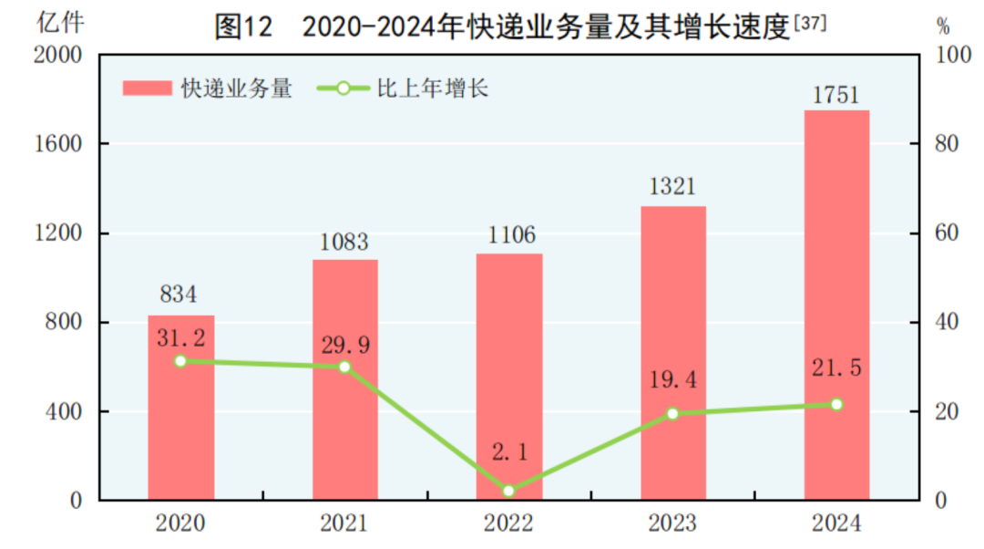 [37]2024年快递业务量统计口径调整,增速按可比口径计算。