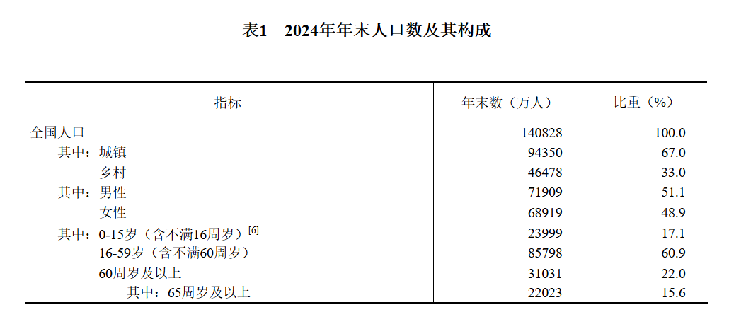 [6]2024年年末,0-14岁(含不满15周岁)人口为22240万人,15-59岁(含不满60周岁)人口为87557万人。