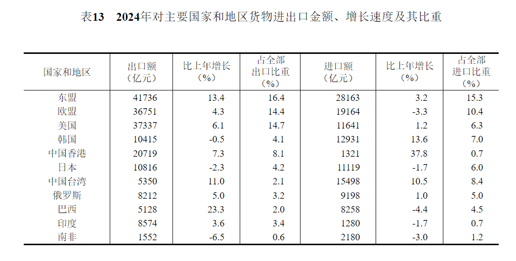 全年货物进出口总额438468亿元,比上年增长5.0%。其中,出口254545亿元,增长7.1%;进口183923亿元,增长2.3%。货物进出口顺差70623亿元。对共建“一带一路”[50]国家进出口额220685亿元,比上年增长6.4%。其中,出口122095亿元,增长9.6%;进口98589亿元,增长2.7%。对《区域全面经济伙伴关系协定》(RCEP)其他成员国[51]进出口额131645亿元,比上年增长4.5%。民营企业进出口额243329亿元,比上年增长8.8%,占进出口总额比重为55.5%;其中出口164717亿元,增长9.4%。