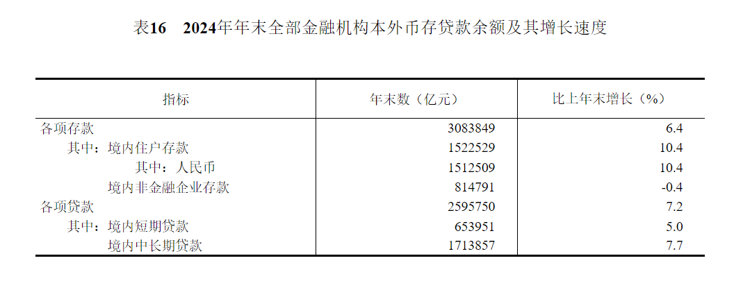 全年社会融资规模增量[52]32.3万亿元,按可比口径计算,比上年少3.3万亿元。年末社会融资规模存量[53]408.3万亿元,按可比口径计算,比上年末增长8.0%,其中对实体经济发放的人民币贷款余额252.5万亿元,增长7.2%。年末全部金融机构本外币各项存款余额308.4万亿元,比年初增加18.5万亿元,其中人民币各项存款余额302.3万亿元,增加18.0万亿元。全部金融机构本外币各项贷款余额259.6万亿元,增加17.3万亿元,其中人民币各项贷款余额255.7万亿元,增加18.1万亿元。人民币普惠小微贷款[54]余额32.9万亿元,增加4.2万亿元。本外币涉农贷款[55]余额51.4万亿元,增加4.7万亿元;制造业中长期贷款余额14.0万亿元,增加1.6万亿元;绿色贷款余额36.6万亿元,增加6.5万亿元。