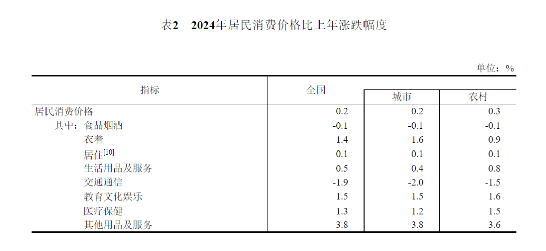 全年居民消费价格比上年上涨0.2%。工业生产者出厂价格下降2.2%。工业生产者购进价格下降2.2%。农产品生产者价格[9]下降0.9%。12月份,70个大中城市中,新建商品住宅销售价格环比上涨的城市个数为23个,持平的为4个,下降的为43个;二手住宅销售价格环比上涨的城市个数为9个,持平的为1个,下降的为60个;新建商品住宅销售价格同比上涨的城市个数为2个,下降的为68个;二手住宅销售价格同比下降的城市个数为70个。