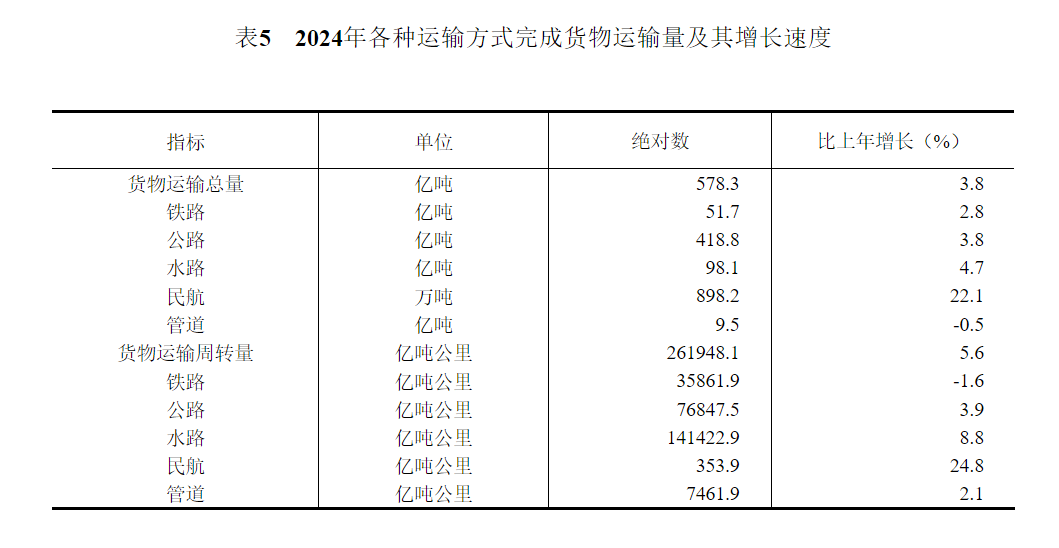 [28]货物运输总量及周转量包括铁路、公路、水路、民航和管道五种运输方式完成量,2024年增速按可比口径计算。