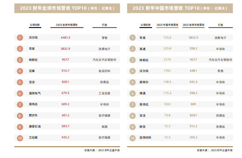 据介绍,报告中,胡润研究院共收集了70家标普500成分股美国企业的数据,这些企业均披露了其在中国市场的营收数据。这些样本企业在全球市场的收入总额超过2.5万亿美元,相当于美国2023年GDP总和的9%。在2023财年,全球营收超过千亿美元的企业有2家,均与消费行业相关。其中,沃尔玛超6000亿美元,苹果近4000亿美元。