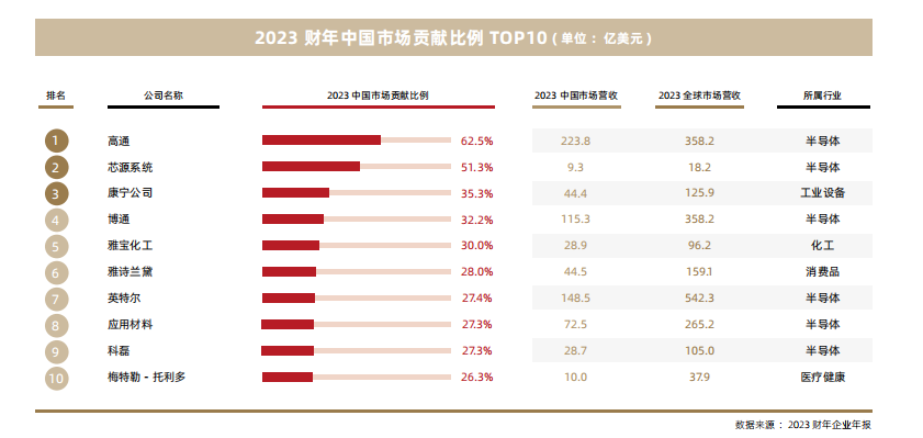 《报告》发现,美国企业在中国市场的营收贡献稳固可观,贡献率稳定在12%及以上。样本企业在中国市场的营收中位数为21.6亿美元,平均数为43.9亿美元。美国企业在中国市场营收规模达百亿美元以上的企业有7家,分别是苹果、高通、特斯拉、沃尔玛、英特尔、博通和英伟达。其中,苹果居首位。41%的企业将中国视为其全球第二大营收来源市场。