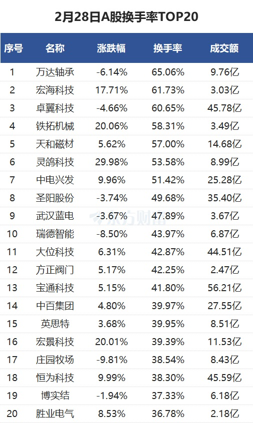 当天换手率最高的个股为万达轴承,全天换手率65.06%。宏海科技紧随其后,全天换手率61.73%。