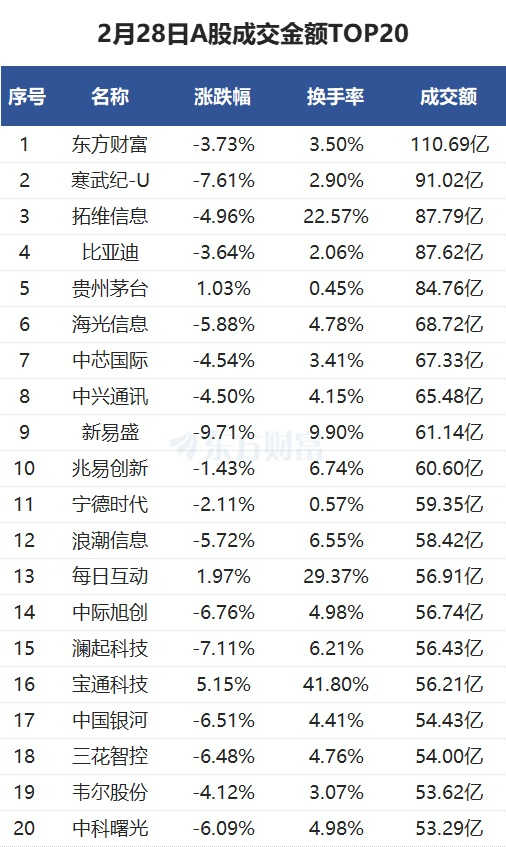 2月28日,上证指数跌1.98%,收报3320.9点;深证成指跌2.89%,收报10611.24点;创业板指跌3.82%,收报2170.39点。
