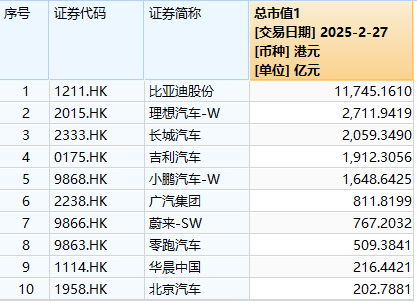 wind数据显示,目前港股市场已有10家乘用车整车上市公司,包括比亚迪、理想汽车、长城汽车、吉利汽车、小鹏汽车、广汽集团、蔚来、领跑等。