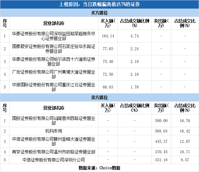 机构现身龙虎榜,江苏吴中跌停(02-28)