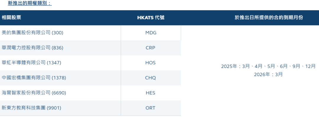 2月28日,香港交易所宣布,将于3月17日推出六只新的股票期权类别。这六只股票分别是美的集团、华润电力、华虹半导体、中国宏桥、海尔智家和新东方。