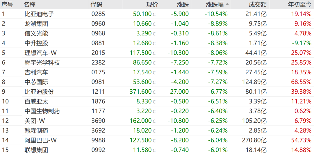 前期涨幅较大的科技股回撤明显。比亚迪电子跌10.54%,龙湖集团跌8.89%,信义光能跌8.61%,领跌蓝筹;商汤跌近8%,中芯国际、华虹半导体跌逾7%。汽车股下挫,零跑汽车、理想汽车、小鹏汽车跌逾8%,吉利汽车跌逾7%。