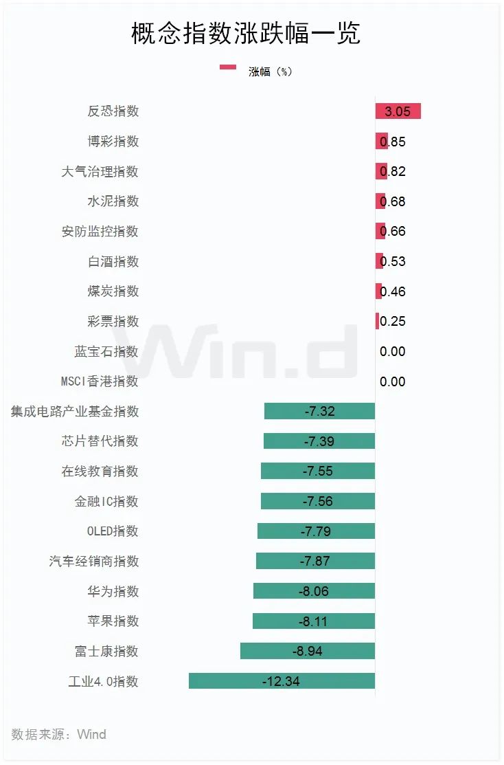 从盘面来看,Wind概念板块多数下跌,工业4.0指数跌12.34%,富士康指数跌8.94%,苹果指数跌8.11%。上涨指数方面,反恐指数涨3.05%,博彩指数涨0.85%,大气治理指数涨0.82%。