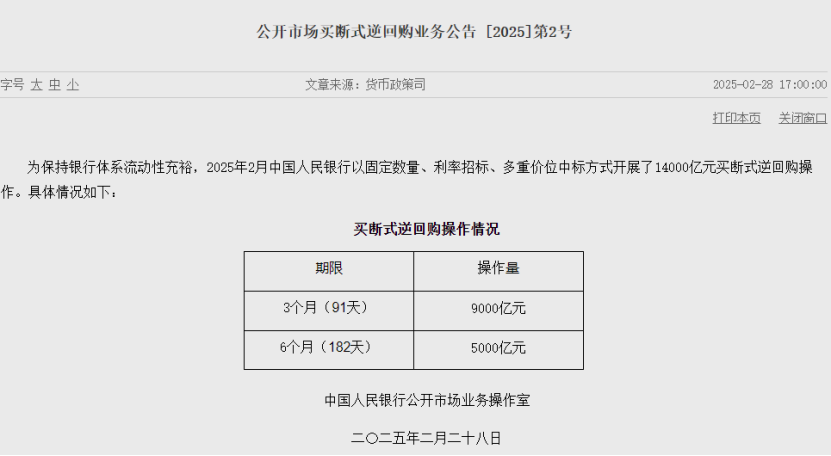为保持银行体系流动性充裕,2025年2月中国人民银行(下称“央行”)以固定数量、利率招标、多重价位中标方式开展了1.4万亿元买断式逆回购操作,分别为3个月(91天)9000亿元、6个月(182天)5000亿元。当天,央行还发布公告称,在2月未开展公开市场国债买卖操作。