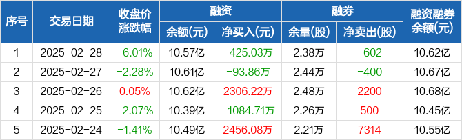 融资方面,当日融资买入1.09亿元,融资偿还1.13亿元,融资净偿还425.03万元。融券方面,融券卖出0股,融券偿还602股,融券余量2.38万股,融券余额568.37万元。融资融券余额合计10.62亿元。