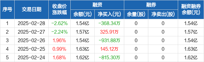 融资方面,当日融资买入397.15万元,融资偿还765.48万元,融资净偿还368.34万元。融券方面,融券卖出0股,融券偿还0股,融券余量0股,融券余额0元。融资融券余额合计1.54亿元。