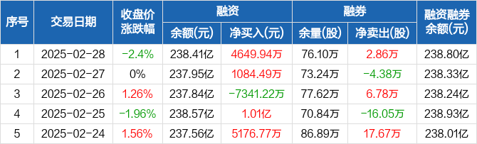 中国平安融资融券信息显示,2025年2月28日融资净买入4649.94万元;融资余额238.41亿元,较前一日增加0.2%