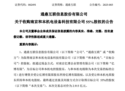 2月28日晚间,通鼎互联信息股份有限公司(以下简称“通鼎互联”或“公司”)发布收购南京和本机电设备科技有限公司55%股权的公告。公告称,公司拟以现金2.915亿元收购南京和本机电设备科技有限公司(下称“和本机电”)55%股权,交易通过增资其控股股东南京亿博企业管理有限公司(下称“亿博有限”)及受让股权方式完成。