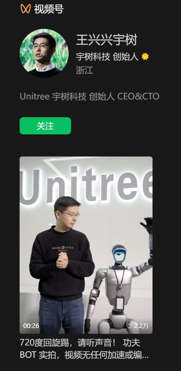 每经AI快讯,3月1日,宇树科技创始人王兴兴开通微信视频号,并在首条视频中展示了人形机器人G1完成720度回旋踢的技能。王兴兴在视频中表示,他会在微信视频号中分享机器人的升级成长过程和趣味瞬间。该账号认证为“宇树科技创始人”,简介为宇树科技创始人、CEO和CTO。此前,王兴兴已经陆续在抖音、小红书、微博等社交平台开通账号,粉丝量颇为可观。