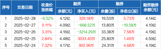 融资方面,当日融资买入3806.03万元,融资偿还3476.85万元,融资净买入329.18万元。融券方面,融券卖出6.84万股,融券偿还1.11万股,融券余量19.53万股,融券余额170.89万元。融资融券余额合计4.14亿元。
