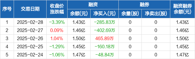 融资方面,当日融资买入787.75万元,融资偿还1073.58万元,融资净偿还285.83万元。融券方面,融券卖出0股,融券偿还0股,融券余量0股,融券余额0元。融资融券余额合计1.43亿元。