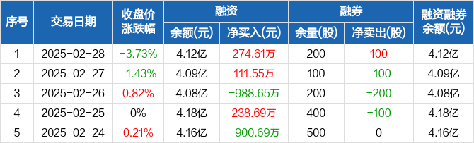融资方面,当日融资买入2335.58万元,融资偿还2060.98万元,融资净买入274.61万元。融券方面,融券卖出100股,融券偿还0股,融券余量200股,融券余额928元。融资融券余额合计4.12亿元。