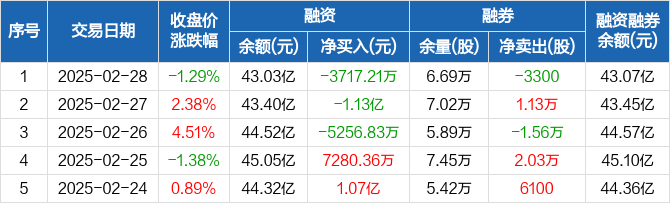 融资方面,当日融资买入4.98亿元,融资偿还5.35亿元,融资净偿还3717.21万元,连续3日净偿还累计2.02亿元。融券方面,融券卖出1.08万股,融券偿还1.41万股,融券余量6.69万股,融券余额474.04万元。融资融券余额合计43.07亿元。