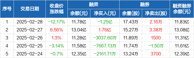 融资方面,当日融资买入2.53亿元,融资偿还3.78亿元,融资净偿还1.25亿元。融券方面,融券卖出3.04万股,融券偿还8800股,融券余量17.43万股,融券余额432.61万元。融资融券余额合计11.83亿元。