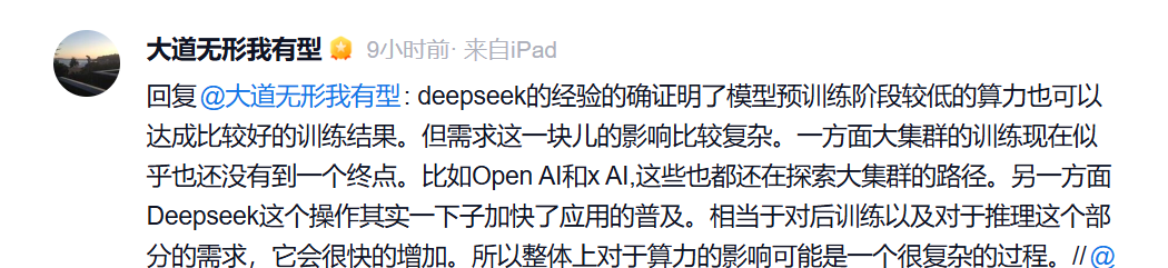 段永平也谈及了DeepSeek。在他看来,DeepSeek的经验的确证明了模型预训练阶段较低的算力也可以达成比较好的训练结果,但对需求的影响比较复杂。一方面,大集群的训练现在似乎也还没有到一个终点。比如Open AI和x AI,也都还在探索大集群的路径。另一方面,DeepSeek这个操作其实一下子加快了应用的普及,相当于对后训练以及推理的需求,会很快的增加。所以整体上对于算力的影响可能是一个很复杂的过程。