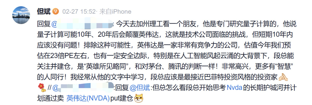 看到段永平关注英伟达,东方港湾创始人但斌也忍不住评论。“今天去加州理工看一个朋友,他是专门研究量子计算的,他说量子计算可能10年、20年后会颠覆英伟达,这就是技术公司面临的挑战,但短期10年内应该没有问题!排除这种可能性,英伟达是一家非常有竞争力的公司,估值今年我们预估在23倍PE左右,也有一定安全边际。”对此,但斌表示,在人工智能风起云涌的大背景下,段永平能关注并建仓,是“英雄所见略同”,和对茅台、腾讯的判断一样。