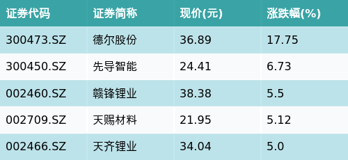 截至午间收盘,固态电池主题涨跌幅最高的五只股票为:德尔股份(300473.SZ)、先导智能(300450.SZ)、赣锋锂业(002460.SZ)、天赐材料(002709.SZ)与天齐锂业(002466.SZ)。详情见下表: