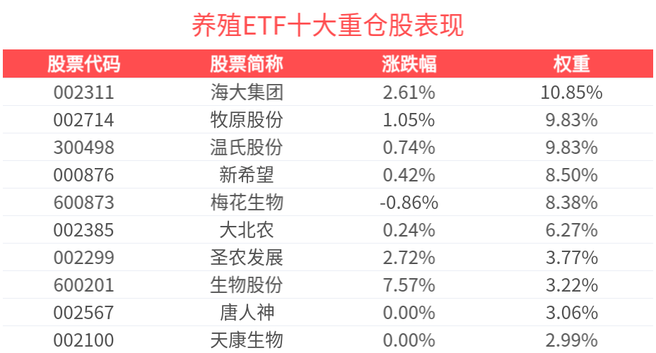 数据显示,截至2025年2月28日,中证畜牧养殖指数(930707)前十大权重股分别为海大集团(002311)、温氏股份(300498)、牧原股份(002714)、新希望(000876)、梅花生物(600873)、大北农(002385)、圣农发展(002299)、生物股份(600201)、唐人神(002567)、天康生物(002100),前十大权重股合计占比69.16%。