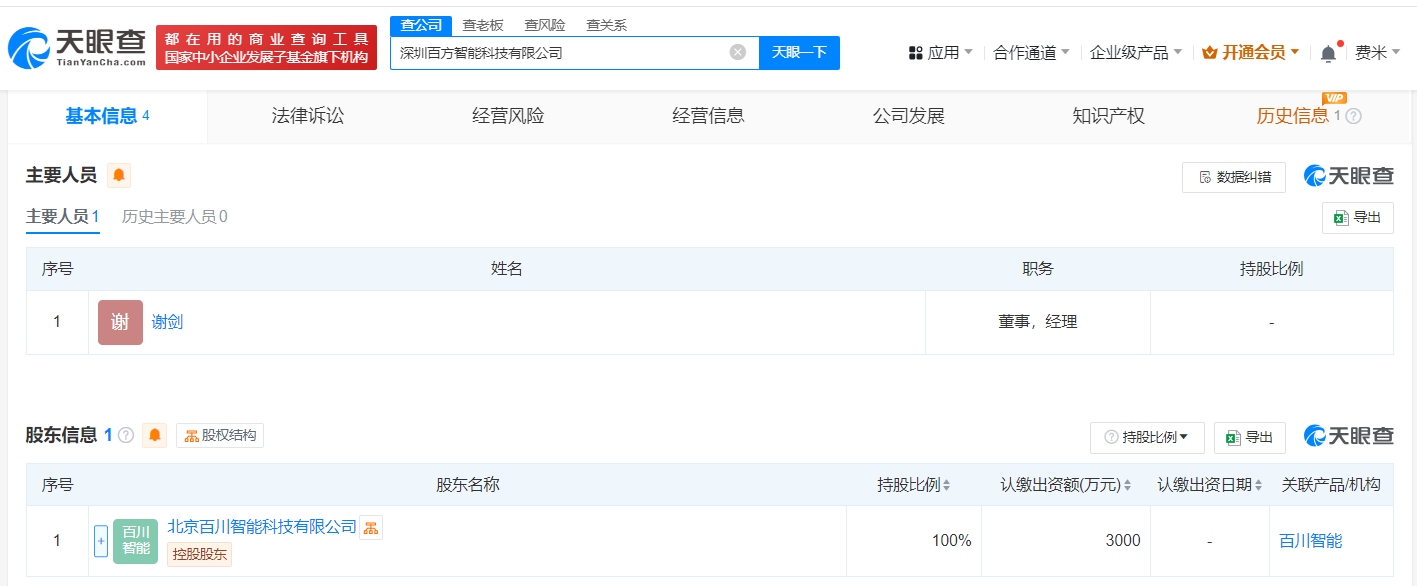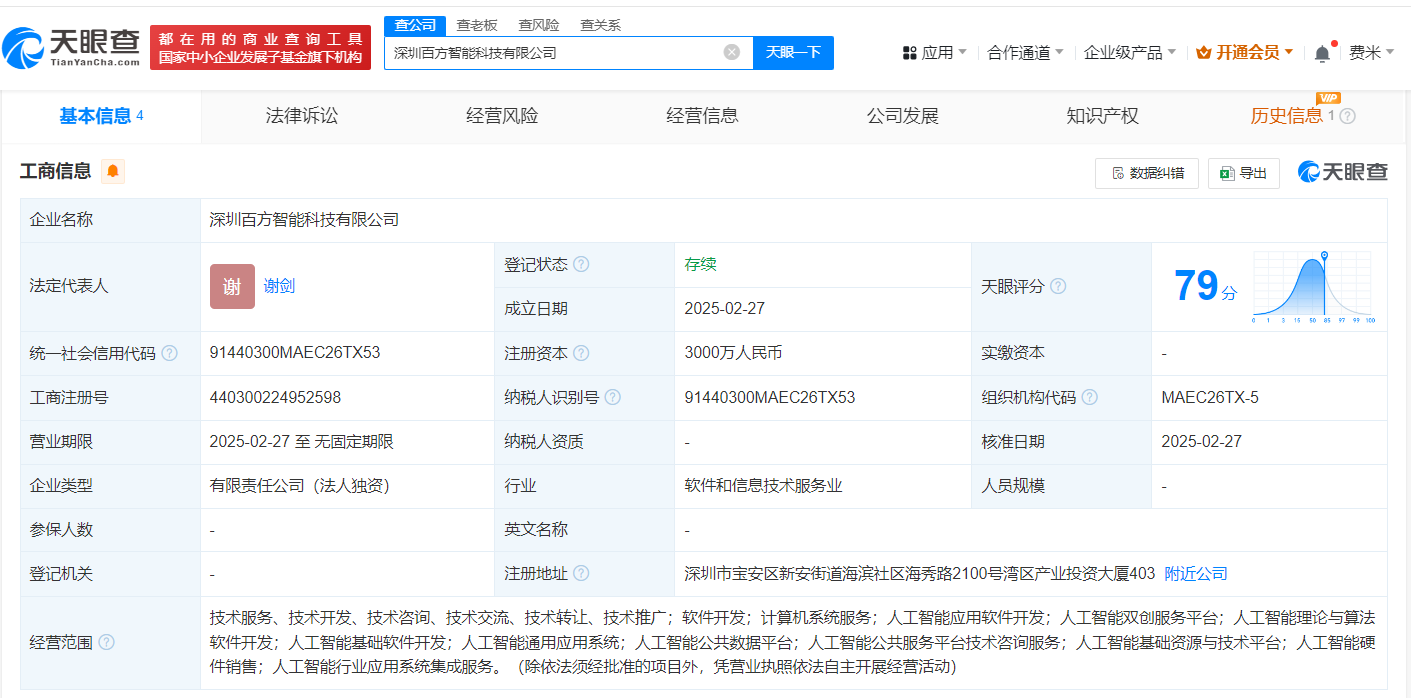 天眼查App显示,近日,深圳百方智能科技有限公司成立,法定代表人为谢剑,注册资本3000万人民币,经营范围含计算机系统服务、人工智能应用软件开发、人工智能双创服务平台、人工智能理论与算法软件开发、人工智能基础软件开发、人工智能通用应用系统等,由北京百川智能科技有限公司全资持股。