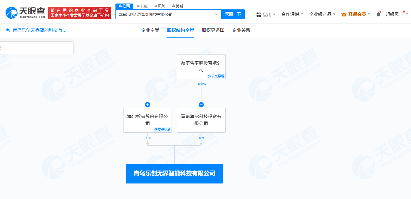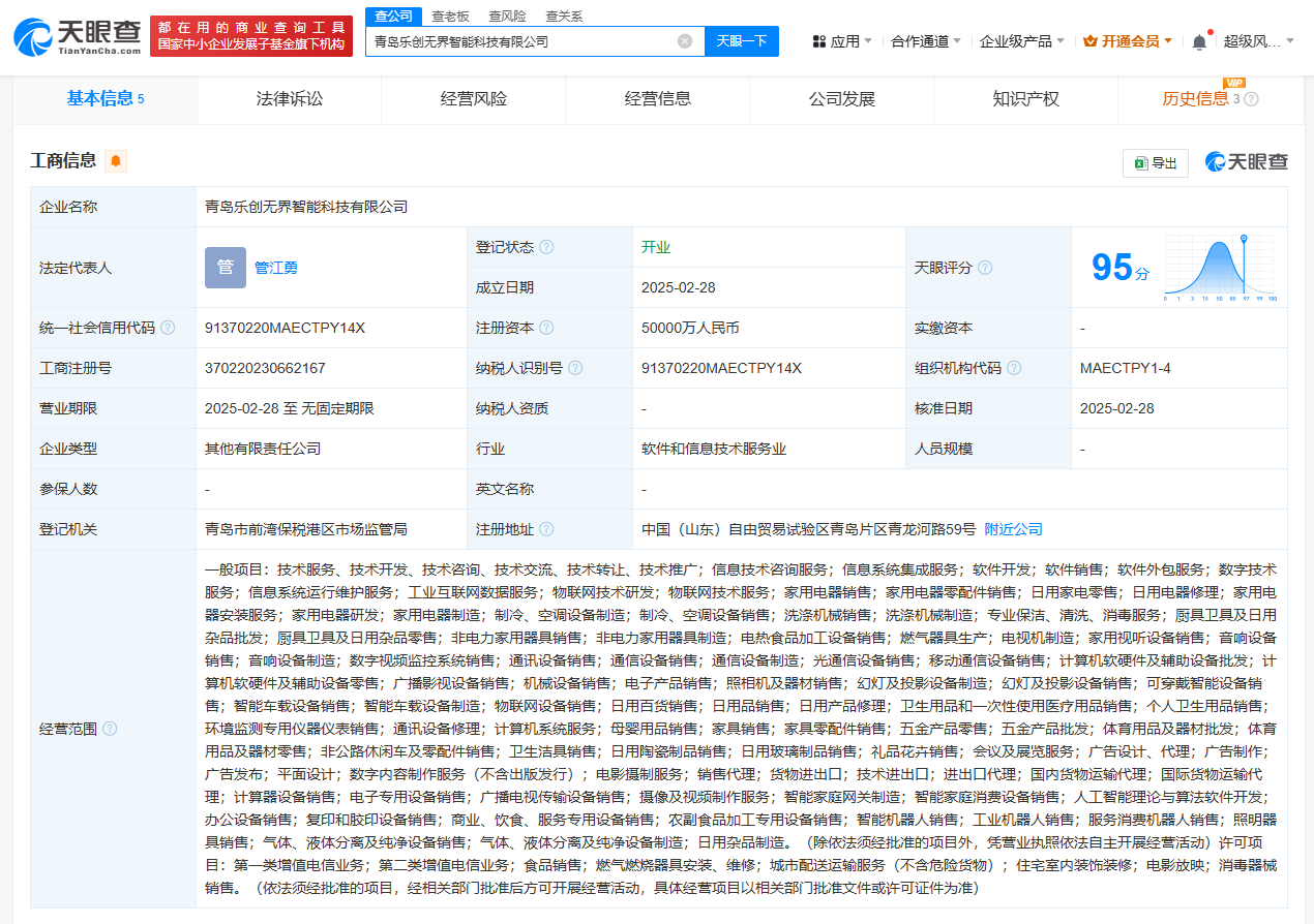 天眼查App显示,近日,青岛乐创无界智能科技有限公司成立,法定代表人为管江勇,注册资本5亿元人民币,经营范围包括工业互联网数据服务、智能车载设备制造、智能机器人销售、工业机器人销售、服务消费机器人销售等。股东信息显示,该公司由海尔智家(600690)及旗下青岛海尔科技投资有限公司共同持股。