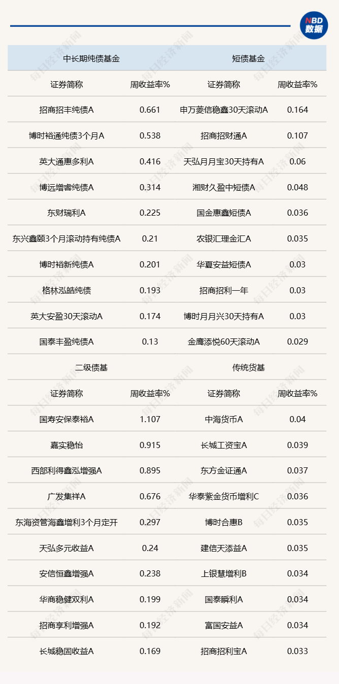 上周,国内债市继续延续弱势震荡的格局,整周利率虽未大幅上行,但周中波幅很大。这也使得各类型债券基金的收益率较此前有所收窄,叠加权益市场回调明显,许多含权债基收益告负。