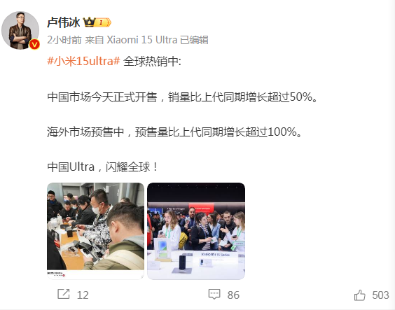 3月3日下午,小米集团总裁卢伟冰在微博发文透露,小米15 Ultra中国市场今天正式开售,销量比上代同期增长超过50%;海外市场预售中,预售量比上代同期增长超过100%。