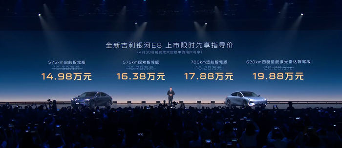 3月3日晚间,新款吉利银河E8正式上市,官方指导价15.38万元起,限时14.98万起售。