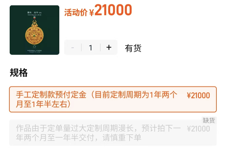 海报新闻记者注意到,在琳朝珠宝天猫旗舰店,一款古法传承黄金花丝宝石镶嵌吊坠香囊,甚至需要提前一年两个月至一年半的时间才能预订。