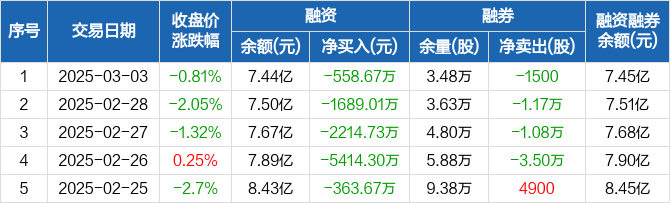 融资方面,当日融资买入4975.3万元,融资偿还5533.97万元,融资净偿还558.67万元,连续5日净偿还累计1.02亿元。融券方面,融券卖出5400股,融券偿还6900股,融券余量3.48万股,融券余额80.67万元。融资融券余额合计7.45亿元。