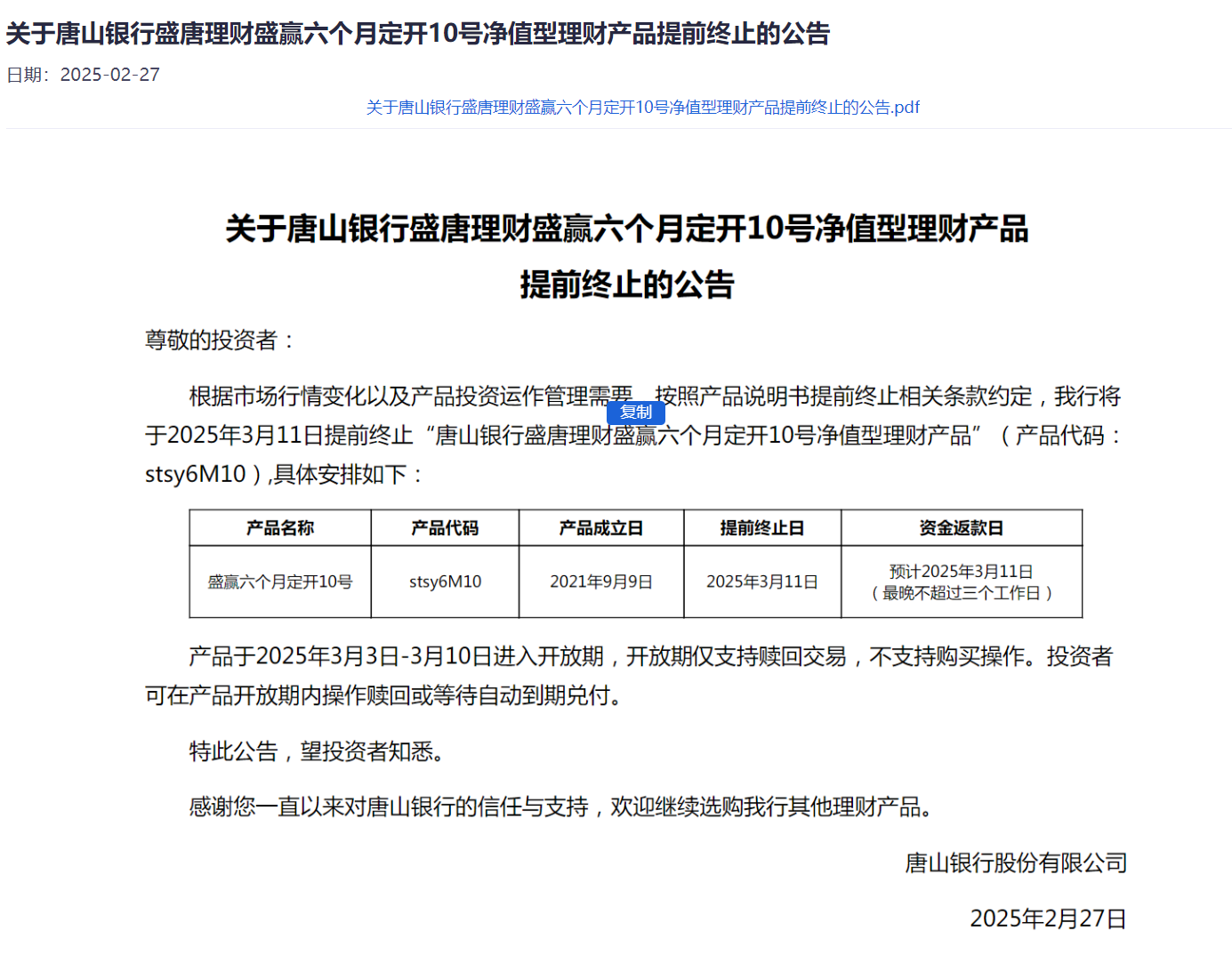 市场行情也会影响理财产品的投资策略,例如,唐山银行盛唐理财盛赢六个月定开10号净值型理财产品提前终止,公告中解释为“根据市场行情变化以及产品投资运作管理需要”。