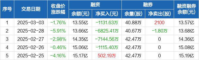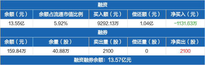 融资方面,当日融资买入9292.13万元,融资偿还1.04亿元,融资净偿还1131.63万元,连续4日净偿还累计1.62亿元。融券方面,融券卖出2100股,融券偿还0股,融券余量40.88万股,融券余额159.84万元。融资融券余额合计13.57亿元。