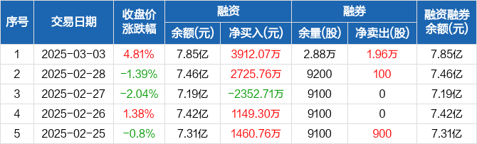 融资方面,当日融资买入1.55亿元,融资偿还1.16亿元,融资净买入3912.07万元。融券方面,融券卖出1.96万股,融券偿还0股,融券余量2.88万股,融券余额25.72万元。融资融券余额合计7.85亿元。