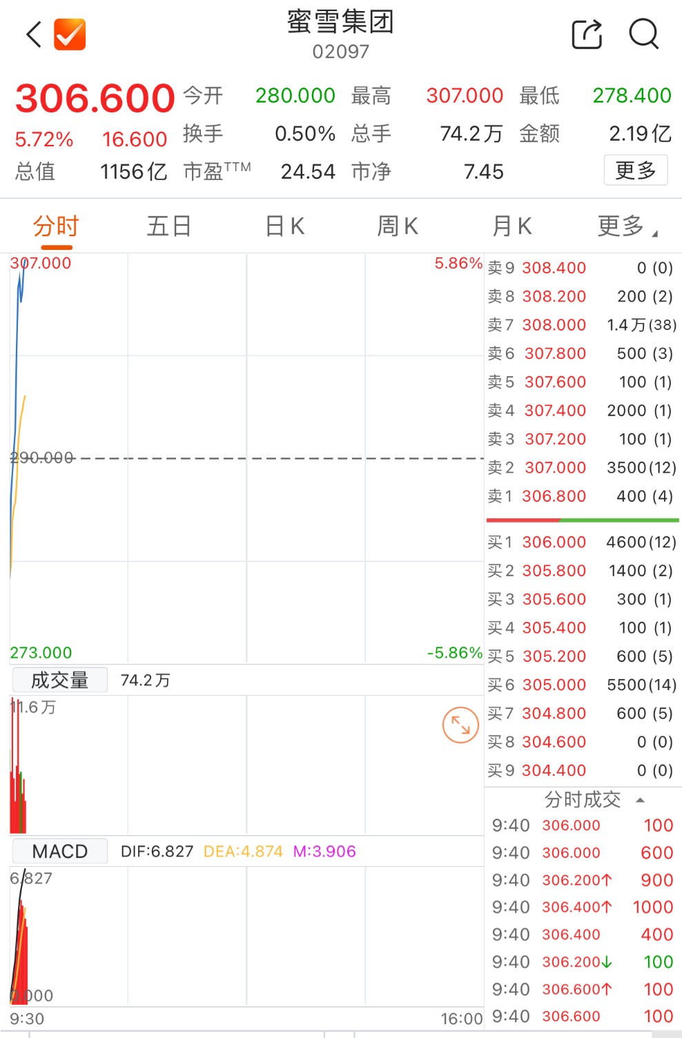 上证报中国证券网讯 3月4日,蜜雪集团股价站上300港元。截至9时41分,该股涨5.72%,报306.6港元/股,总市值达1156亿港元。