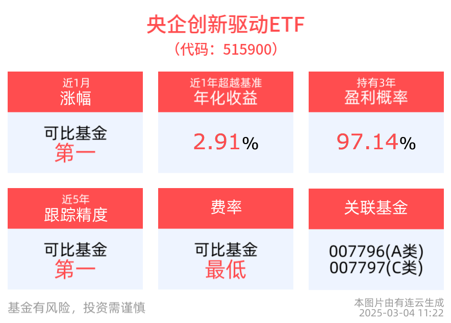 截至2025年3月3日,央企创新驱动ETF(515900)近1月涨幅排名可比基金首位。