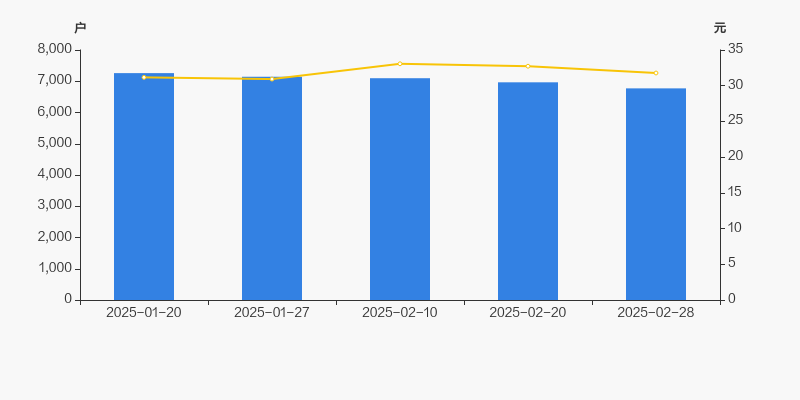 截至2025年2月28日,公司最新总股本为6464万股,其中流通股本为6237.5万股。户均持有流通股数量由上期的8954股上升至9211股,户均流通市值29.27万元。