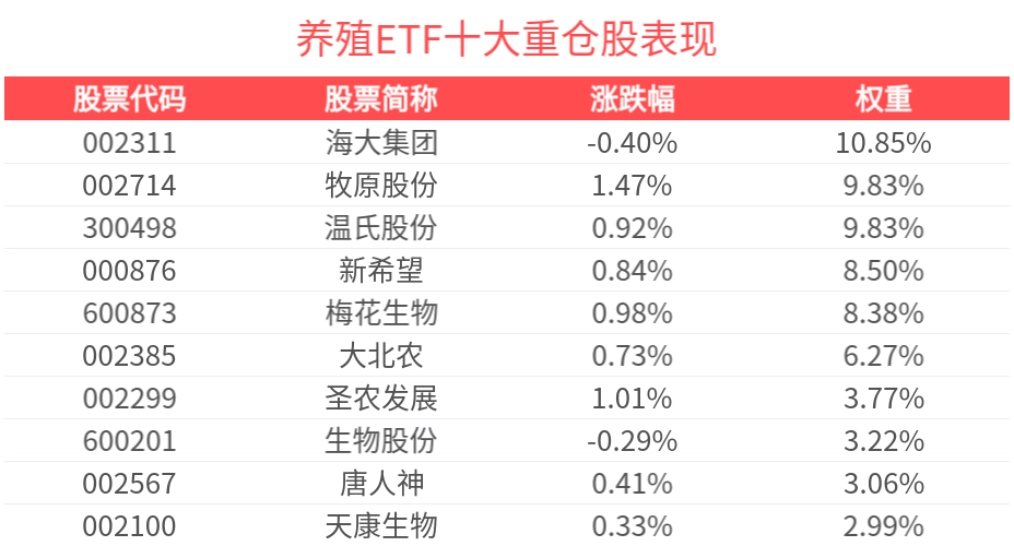 数据显示,截至2025年2月28日,中证畜牧养殖指数(930707)前十大权重股分别为海大集团(002311)、温氏股份(300498)、牧原股份(002714)、新希望(000876)、梅花生物(600873)、大北农(002385)、圣农发展(002299)、生物股份(600201)、唐人神(002567)、天康生物(002100),前十大权重股合计占比69.16%。