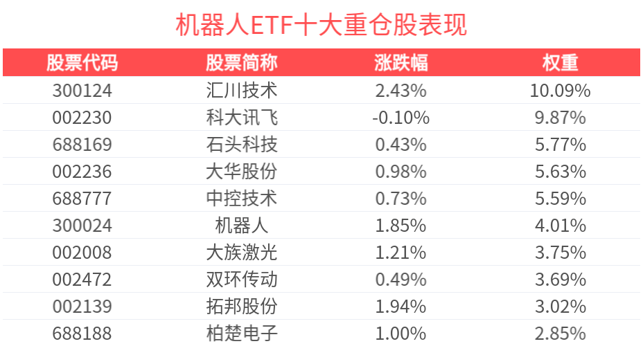 数据显示,截至2025年2月28日,中证机器人指数(H30590)前十大权重股分别为汇川技术(300124)、科大讯飞(002230)、石头科技(688169)、中控技术(688777)、大华股份(002236)、双环传动(002472)、机器人(300024)、大族激光(002008)、巨轮智能(002031)、拓邦股份(002139),前十大权重股合计占比50.7%。