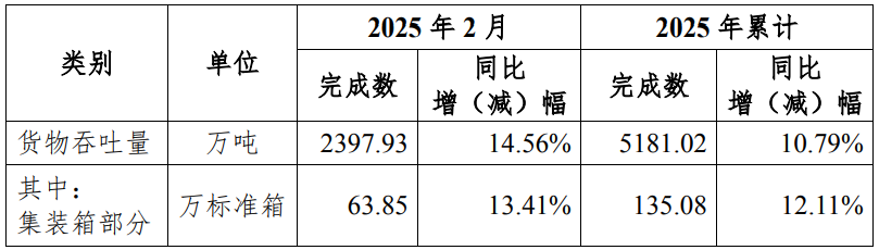 3月4日,北部湾港(000582)发布公告,2025年2月的港口吞吐量数据显示如下图: