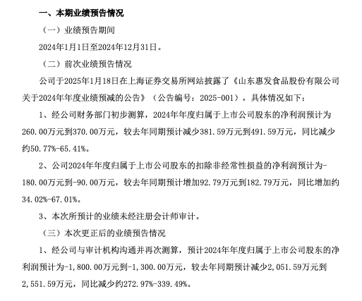3月4日晚间,山东惠发食品股份有限公司关于2024年年度业绩预告更正的公告。该公司将2024年业绩预告更正为预计2024年净亏损1300万元-1800万元。此前惠发食品预告公司2024年盈利260万元到370万元。